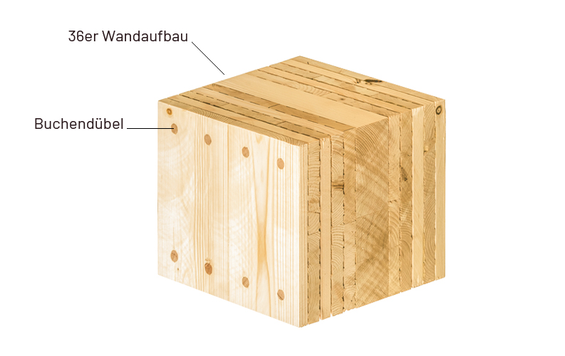 Ab 17cm Wandstärke beginnt Holz, als natürlicher Wärmespeicher zu wirken. Ab 36,4 cm wird keine zusätzliche Dämmung mehr benötigt – das spart in jeder Klimazone extrem und nachhaltig Heiz- und Kühlkosten. Wärmedämmung und Speichermasse sind konkurrenzlos.